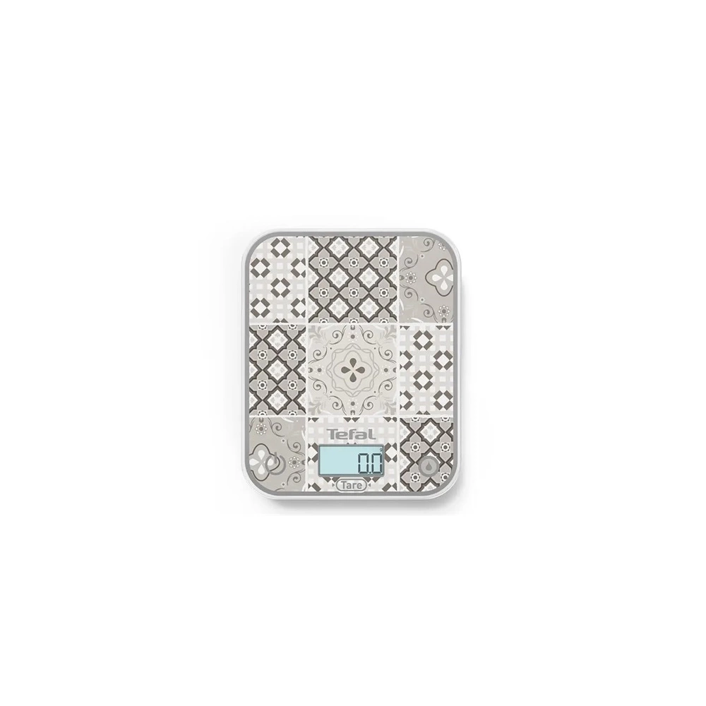 Tefal Konyhamérleg digitális 5kg szürke/mozaik Optiss Mozaic BC50D6V0 - Méréshatár: 5 kg - Mérési pontosság: 0,5 g - Tára funkcióval - Mértékegységek: g/oz, lb; víz ml/cup; tej ml/cup - Csúszásmentes talpak - Automatikus kikapcsolás - Tápellátás: 2 x 1,5 V (AAA) elem, nem tartozék - Méret: 17,5 x 21,5 cm