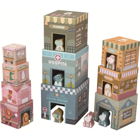 Fa készségfejlesztő városi torony állatokkal 18 db-os