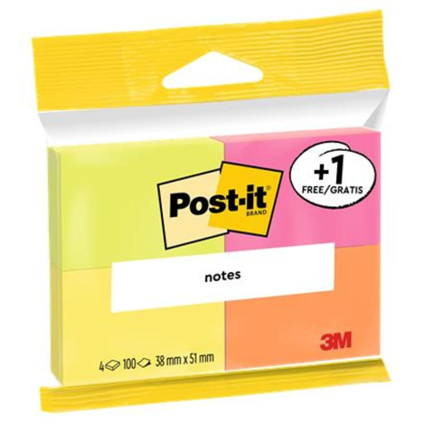 1 kép 3M POSTIT Öntapadó jegyzettömb, 38x51 mm, 4x100 lap, 3M POSTIT, "Neon"