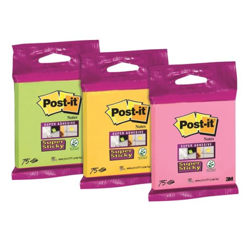 Öntapadó jegyzettömb, 76×76 mm, 75 lap, 3M POSTIT "Super Sticky", vegyes - LP6820SS3 - Közepes méretű öntapadó jegyzettömbök - erős tapadás