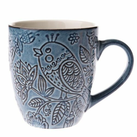 A virágos csendéletben lévő madármotívummal díszített kerámia bögre gyönyörű kék dizájnban a családdal töltött pillanatok és a délutáni kávé vagy tea szerves részévé válik.