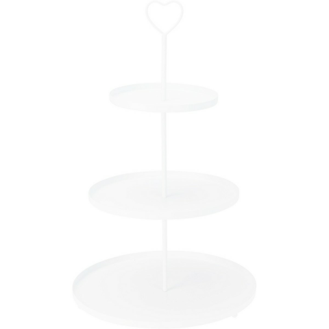 A 30 × 30 × 48 cmméretű fém ételállvány elegáns kiegészítője a édes és sós finomságok tálalásának. Fehér színű kialakításának köszönhetően finom és ízléseshatást kelt , így mindennapi családi étkezésekhez, mind pedig ünnepi alkalmakhoz, például ünnepségekhez vagy teázásokhoz is alkalmas.Az etagér szilárd fémből készült, ami stabilitást és hosszú élettartamot biztosít. A három kör alakú szint elegendő helyet biztosít sütemények, tort