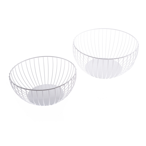 A két egyszerű, elegáns megjelenésű drótból készült gyümölcstál praktikus kiegészítője bármely otthonnak, többféleképpen használható gyümölcstárolásra és dekorációra.A tálak lakkozott fémhuzalból készültek. A dróttálak előnye, hogy nyitottak és szellősek, és a bennük lévő gyümölcs nem romlik meg hamar. A telt aljú drót tálakat újra lehet használni kisebb gyümölcsök, például cseresznye, ribizli vagy egres számára, szezonon kívül pedig