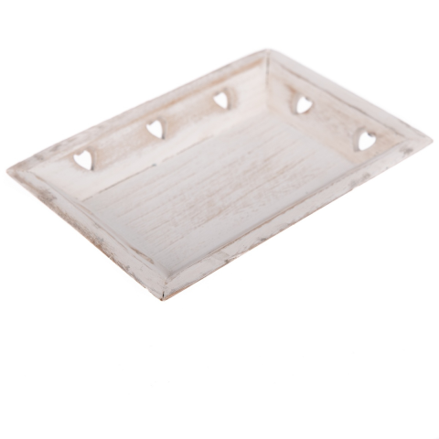 A fehér színű, finom szív alakú kivágásokkal ellátott, fából készült tálca minden otthonban megtalálja a helyét, köszönhetően a sokféle felhasználási lehetőségének. A fából készült tálca tökéletesen alkalmas rágcsálnivalók vagy italok tálalására. Minden családi vagy baráti összejövetelhez tartozik egy praktikus kiegészítő a tálca formájában, amely megvédi az asztal felületét az esetleges szennyeződésektől. A tálca tökéletesen használhat