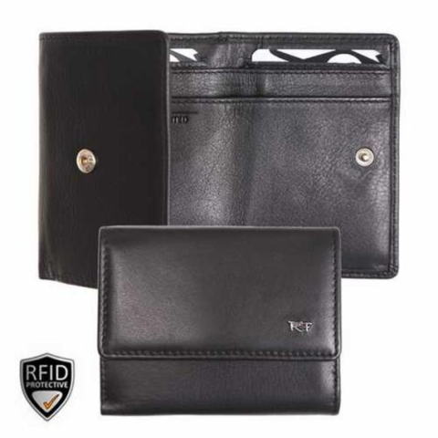 021520 002 Riccardo Ferducci női bőr pénztárca fekete Méret: 10,2 x 7,7 x 2,3 cm Papírpénz tartó: 2 db Aprópénz tartó: 1 db Kártyatartó: 5 db RFID védelem