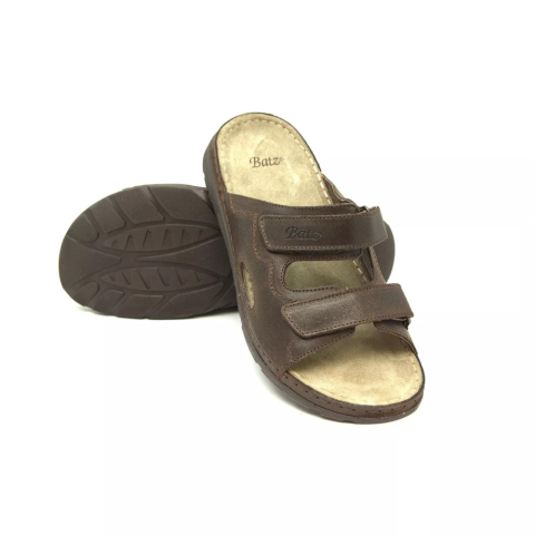Batz Mike férfi papucs barna színben. 100% valódi, válogatott minőségű bőr felsőrészű és 100% marhabőr talpbélésű férfi papucs. Anatómiai kialakítású párnázott talpszerkezete maximális kényelmet biztosít a lábnak. 2 db tépőzáras pántjának köszönhetően, a