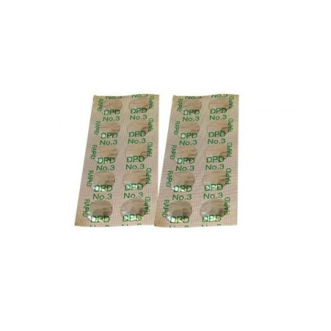 DPD-3 indikátor tabletta, medencevíz kötött klór tartalmának méréséhez. A tablettát a mérőedény (teszter) megfelelő cellájába kell helyezni, miután a mérni kívánt vízzel a cellát feltöltötte. A tabletta feoldódva a mérővíz színét megváltoztatja a kötött k