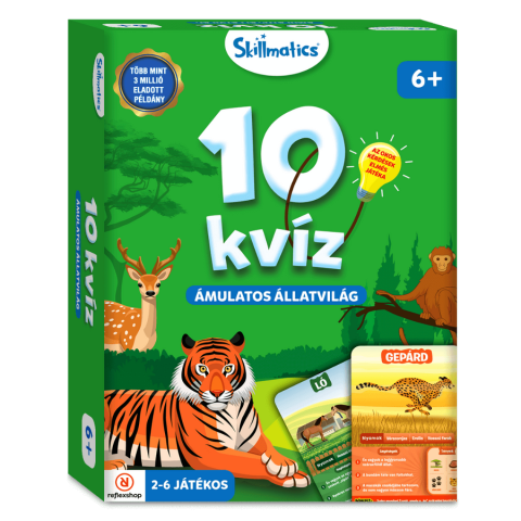Merülj el a „10 Kvíz – Ámulatos állatvilág” izgalmaiban, ahol 52 lenyűgöző állat vár rád! Kérdezz bölcsen: vajon ragadozó, háziállat, vagy csoportosan él? Fejleszd tudásodat játék közben, és nyerj meg minél több kártyát a családi játéknapokon! Merülj