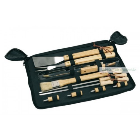 Grill készlet,minőségi rozsdamentes acélból,fa nyéllel,cipzáras táskába csomagolva Méret: 43 x 33,5 cm Rendelésre: 5-10 nap! Anyag: Rozsdamentes acél / Poliészter / Fa Szín: fekete, fa Nettó súly: 0,8kg Bruttó súly: 0,91kg
