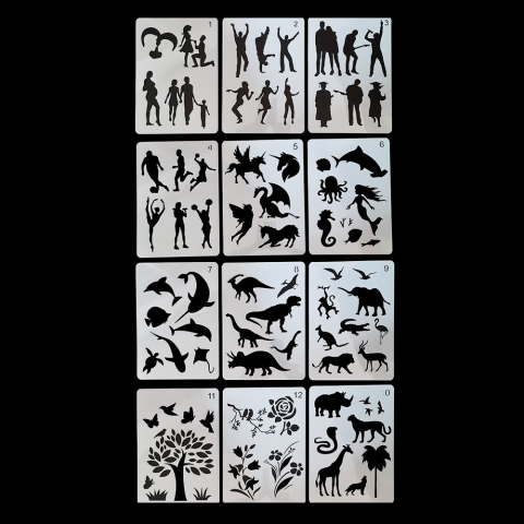 Tortadíszítő stencil és sablon vegyes mintákkal, melynek segítségével egyszerűen díszíthetjük tortáinkat, süteményeinket. A minták között megtalálhatóak a állat, növény, dinoszaurusz, halak és tenger élővilága, mesebeli lények és emberek különböző élethe