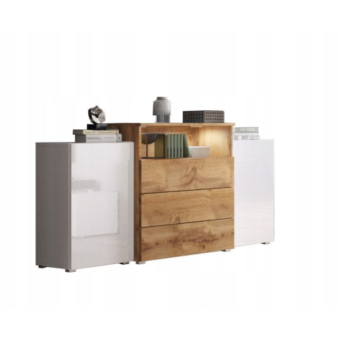 1 kép 150 cm-es fiókos komód nappaliba, fiókokkal, oldalsó szekrényekkel, fehér fényes előlapokkal