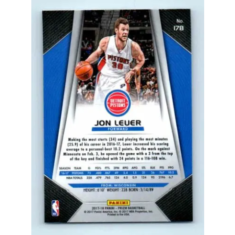 Az eladásra kínált 2017-18 Prizm Basketball Base # 178 Jon Leuer kosaras kártya NM-MT állapotban van. A kosaras kártyákat legtöbb esetben UP Platinum/Standard puha védőtokban és/vagy UP Toploader (kemény védőtok)-ben küldjük. Az eladásra kínált 2017-18
