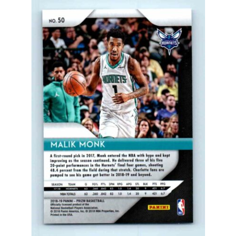 Az eladásra kínált 2018-19 Panini Prizm # 50 Malik Monk kosaras kártya NM-MT állapotban van. A kosaras kártyákat legtöbb esetben UP Platinum/Standard puha védőtokban és/vagy UP Toploader (kemény védőtok)-ben küldjük. Az eladásra kínált 2018-19 Panini