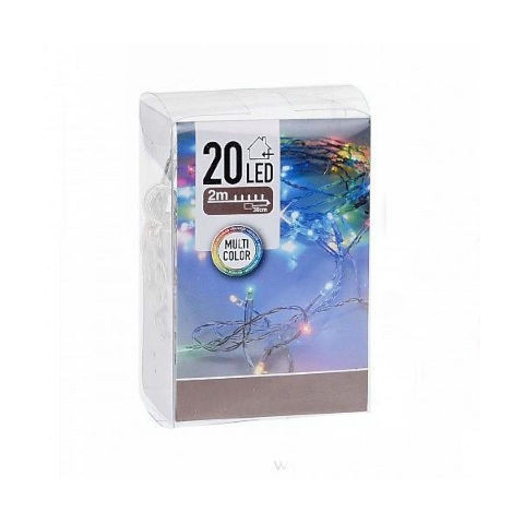 Beltéri világítás, 20 LED-el - 2 méter hosszú 3 mm-es gömb ledekkel, 10 cm-ként. 0,08 mm2 keresztmetszetű átlátszó huzallal. Anyaga: műanyag, Hossza: 2 méter LED-ekkel + 0,3 méter elektromos vezeték ledek nélkül. Elemet nem tartalmaz! Vegyes színekkel.