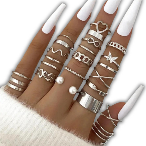 22 darabos gyűrű szett elegáns és modern dizájnnal ezüst színben. Tökéletes kiegészítő minden alkalomra, állítható méretekkel
