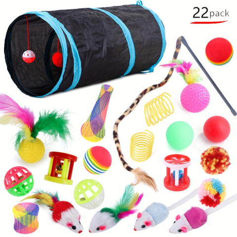 (Fedezd fel a) macskád belső vadászát a 22 darabos macskajáték készlettel, amely minden cicának izgalmas és változatos játékélményt kínál. Az összecsukható alagúttal és csengővel ellátott szett ideális választás, hogy kedvenced soha ne unatkozzon. A külön