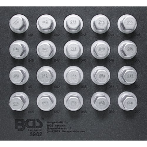 BMW kerékőr csavarok szakszerű használatához;17 mm-es hatlap hajtás;1/6-os szerszámtálcában.A következő kerékőr dugókulcs fejeket tartalmazza:#41 - #42 - #43 - #44 - #45 - #46 - #47 - #48 - #49 - #50#51 - #52 - #53 - #54 - #55 - #56 - #57 - #58 - #59