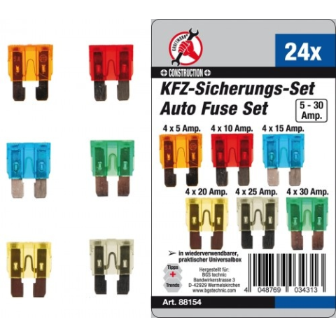 A készlet tartalma: - 4 biztosíték, 5 A (narancs) - 4 biztosíték, 10 A (piros) - 4 biztosíték, 15 A (kék) - 4 biztosíték, 20 A (sárga) - 4 biztosíték, 25 A (áttetsző) - 4 biztosíték, 30 A (zöld)