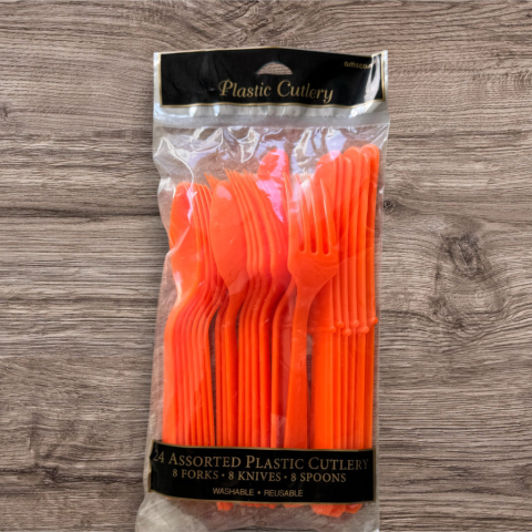 24 darabos műanyag evőeszköz készlet-halloween színben. - 8 db villa - 8 db kés - 8 db kanál