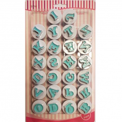 26 részes ABC kiszúró fondantokhoz A betűk méretei kb.: 18 mm × 18 mmAnyaga: műanyag