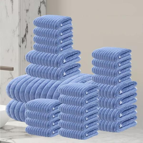 26 részes törölköző szett kék DE7728488-KDarabszám: 26 db — egy nagy, teljes szett, amely bőven elég lehet akár több személy számára is.Törölközőtípusok / méretek: A szett valószínűleg többféle méretet tartalmaz — például fürdőtörölközőket, kéztörlőket, mosdó‑ vagy arc‑ törölközőket, így szinte minden igényt lefed: zuhanyzáshoz, fürdéshez, kéz / arc törléshez, sőt akár edzőtermi vagy strand használathoz is.Anyag: mikroszálas / ultra