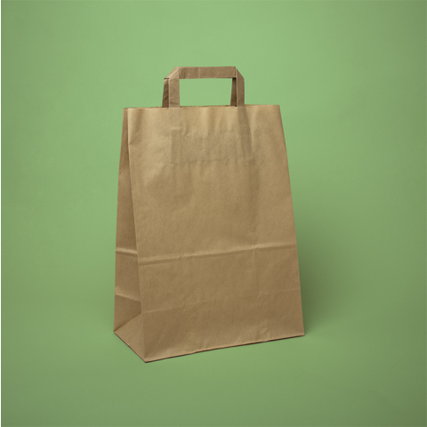 Hagyományos szalagfüles papírtáska, újrahasznosítható alapanyagból. Leggyakrabban a vendéglátásban vagy a kereskedelemben használják. A papírtáska teherbíró képessége kb. 3-4 kg. Méret: 26x14x35 cm (szélesség x talp x magasság), álló formátum.A papír..