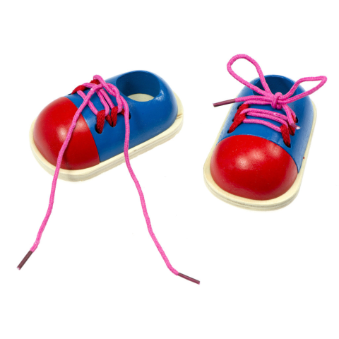 Oktató készlet a cipőfűző megkötésének megtanulásához, sok gyermeket érdekel, fejleszti a gyermekek motoros készségeit. anyag: fa, méretek: 6.8*3.5*11 cm, a készlet két pár cipőt tartalmaz