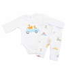2 részes szett Autós mintával Ez a 2 részes, autós mintával díszített szett igazi ínyencség a kicsik számára. A szett egy hosszú ujjú, vállonpatentos bodyból és egy baba nadrágból áll, mindegyik darabot finom, puha pamutból készítettük. A nadrág rugalmas