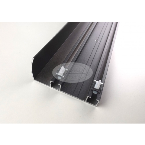 Antracit (sötétszürke) színű, alumínium alapanyagú jó minőségű, erős két pályás függönysín több méretben. A szett tartalma: - antracit színű alumínium profil 4 cm magas előlappal a kiválasztott hosszúságban - 1 pár műanyag végzáró, mely eltakarja a sín k