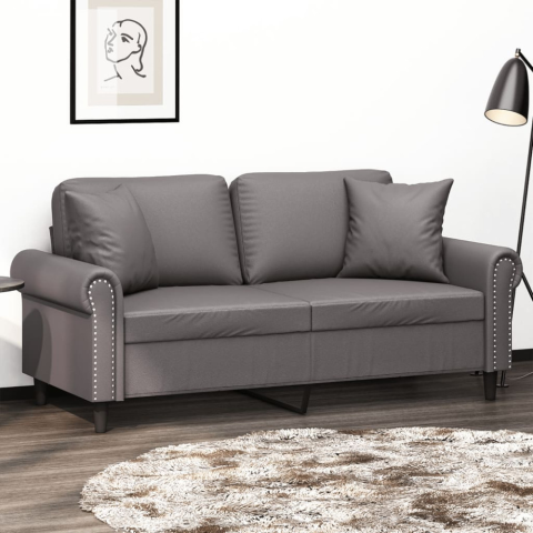 2 személyes szürke műbőr kanapé díszpárnákkal 140 cm bútor termékleírás