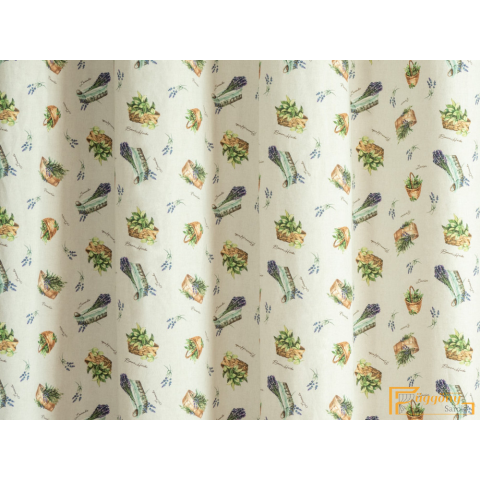 ◤Kategória: Dekor függöny. Asztalterítő is készülhet belőle ◤Minta: Levendula kosárkával ◤Szín: Bézs alapon ◤Szélessége: 140 cm ◤Rapport függőleges: 22 cm. Rapport vízszintes: 45.5 cm. Súly: 210 g/m2 ◤Anyagösszetétel: 100% Pamut A megjelölt ár 1 folyómé