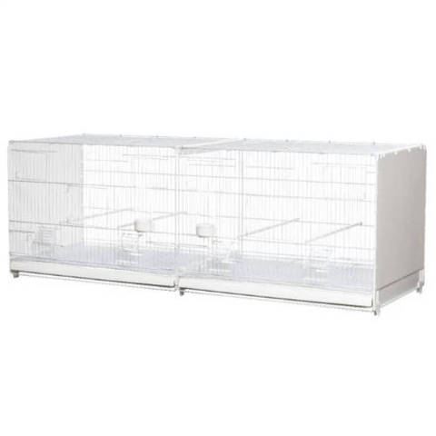 Cikkszám: 401Fehér drótból készült tenyészketrec, tartozékokkal. Ideális kanárik, pintyek, hullámos papagájok és hasonló kismadarak számára. 4 db fészkelődoboz ajtó2 db főbejárat4 db etetőajtó4 vályús etetőajtó2 x itató4 db etető4 db ülőrudak2 db kihúzható műanyag fiók1 x tömör műanyag középső elválasztó2 x alsó rácsMérete: cm. 122*42*44,5h/48*16,5*17,5 hüvelykKönnyű súly