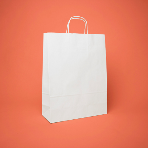 Hagyományos sodrottfüles papírtáska, újrahasznosítható alapanyagból. Leggyakrabban a vendéglátásban vagy a kereskedelemben használják. A papírtáska teherbíró képessége kb. 3-4 kg. Méret: 32x12x41 cm (szélesség x talp x magasság), álló formátum, kb. A..
