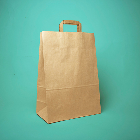 Hagyományos szalagfüles papírtáska, újrahasznosítható alapanyagból. Leggyakrabban a vendéglátásban vagy a kereskedelemben használják. A papírtáska teherbíró képessége kb. 3-4 kg. Méret: 32x16x45 cm (szélesség x talp x magasság), álló formátum, kb. A3..
