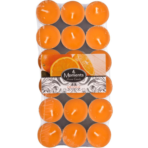 36 darabos teamécses narancs illatú, 23 cm magas, 4 óra égési idővel.