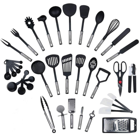 38 darabos rozsdamentes acél konyhai eszközkészlet – holm8274Ez a 38 részes konyhai eszközkészlet minden olyan kelléket tartalmaz, amelyre a mindennapi főzés során szükséged lehet. A praktikus és speciális eszközök széles választéka biztosítja, hogy a konyhádban minden feladatot könnyedén és hatékonyan elvégezhess – az előkészítéstől a főzésen át egészen a tálalásig.Főbb jellemzők:Teljes felszereltség – alapvető konyhai kellékek, speciális szersz