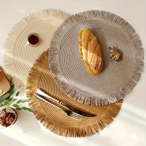 (Fonott design) Fedezd fel a stílusos és praktikus megoldást étkezőasztalod díszítésére a három darabos kerek fonott papír asztali alátét készletünkkel! Ezek az alátétek nemcsak gyönyörűen mutatnak, hanem meg is védik az asztalodat a mindennapi használat