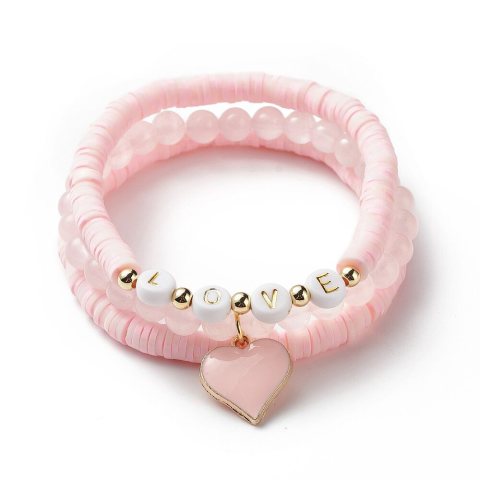 1 kép 3 db-os rózsakvarc és akril női karkötő, 18 cm, Love felirattal