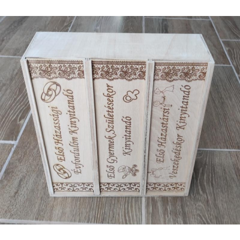 Italos doboz 3 fakkos Elsősorban nászajándékba de kérhető egyedi felirattal is évfordulóra pl. Mérete: kb 31,5 x 34,5 cm,mélysége 11,5 cm a külső méret. Belül a fakkok kb. 8,5 x 8,5 x 33,3 cm. Boros vagy pezsgős palack biztosan belefér. A kép illusztrá