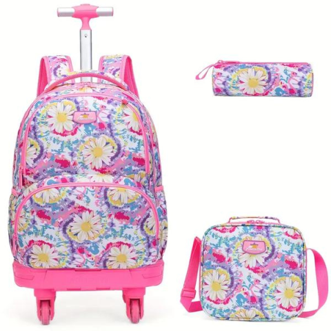 3 részes gurulós iskolatáska szett lányoknak – virágos GX3837803-1Ez a 3 az 1-ben iskolatáska szett tökéletes választás fiatal lányok számára, akik szeretik a vidám, színes mintákat és a praktikus megoldásokat. A szett tartalmaz egy gurulós hátizsákot teleszkópos fogantyúval, egy uzsonnás táskát és egy tolltartót, egységes mintával és színvilággal.A szett tartalma:Gurulós iskolatáskaMéret: 47 × 30 × 20 cmKényelmes párnázott vállpántokTeleszkópos húz
