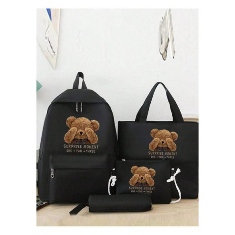 3 részes iskolatáska szett macis mintával – Hátizsák, válltáska és tolltartó 115412468Ez az aranyos, 3 részes táskakészlet ideális választás iskolások vagy hétköznapi használatra. A szett egy nagy méretű hátizsákot, egy praktikus válltáskát és egy hozzá illő cipzáras tolltartót tartalmaz. Mindhárom darabot egy puha plüssmackóval díszített minta ékesíti, amely a „Surprise Moment – One Two Three” felirattal játékos és vidám megjelenést biztosít.A