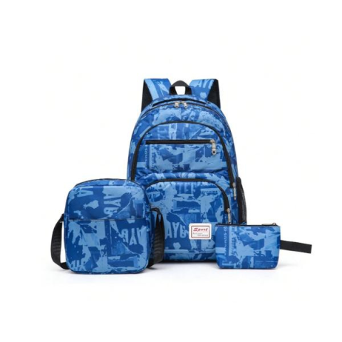 3 részes kék iskolatáska szett 125709615Ez a kék, modern mintázatú, 3 részes táskakészlet ideális választás iskolába, kirándulásokra vagy hétköznapi használatra. A szett egy nagy méretű hátizsákot, egy praktikus válltáskát és egy hozzá illő cipzáras tolltartót tartalmaz. Könnyű, strapabíró anyaga és divatos megjelenése miatt egyaránt hasznos és stílusos választás diákok számára.A szett tartalma:1 db hátizsák – tágas belső térrel, több cipzáras