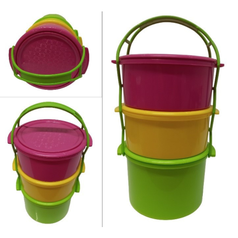 Színes ételhordó, műanyag ételesdoboz 3 részes kétszemélyes kivitelben, amely az élelmiszerek szállítására és tárolására szolgál. Minden tál külön műanyag fedéllel van ellátva. Praktikus fogófüle a három részt szállítás, emelés közben összetartja. Mikrohu