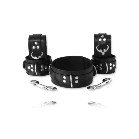 3részes bőr SM készlet.Kézbilincs,láb bilincs karabínerrel vastagbőrből.2Pár.Szélességük:5cm Vastagbőr nyakörv karikákkal.Állítható méret.A nyakörv szélessége:5cm