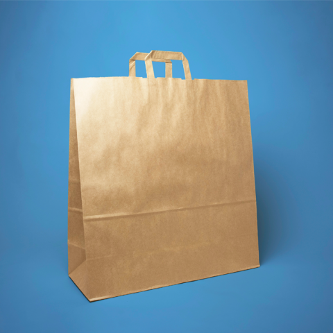 Hagyományos szalagfüles papírtáska, újrahasznosítható alapanyagból. Leggyakrabban a vendéglátásban vagy a kereskedelemben használják. A papírtáska teherbíró képessége kb. 3-5 kg. Méret: 45x17x48 cm (szélesség x talp x magasság), álló formátum.A papír..