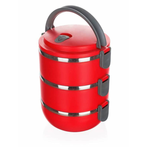 Banquet Culinaria 3 részes ételhordó INOX belsővel Mérete: Ø14,5 cm Űrtartalma: 3x0,55 l (összesen 1,65 l) Anyag: Belseje rozsdamentes acél, külső része strapabíró műanyag Szín: Piros A Banquet Culinaria 3 részes műanyag ételhordó tökélet