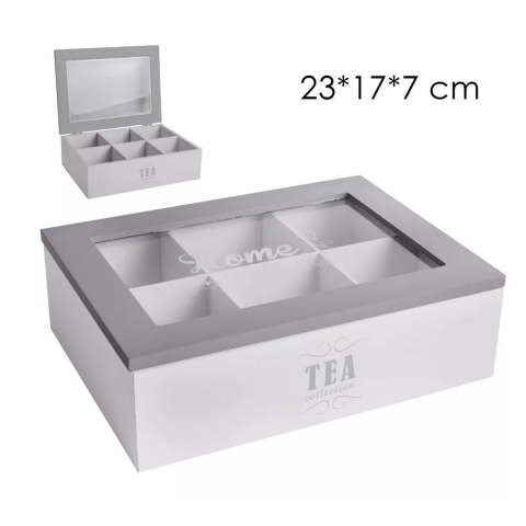 Teatartó doboz fából,üveg tetővel.Három féle színben. Méretei:23x17x7 cm