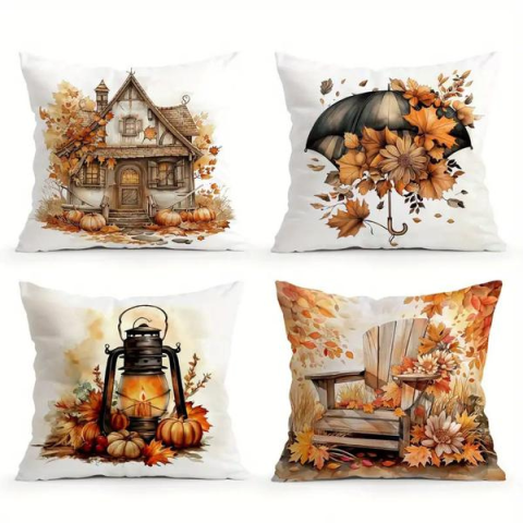 4 darabos Őszi Díszpárnahuzat Szett – 45×45 cm QA2911013Ez a 4 darabos őszi díszpárnahuzat szett meleg és barátságos hangulatot teremt bármely otthonban. A különböző minták – házikó tökökkel, esernyő őszi levelekkel, vintage lámpás és veranda szék – egyedi, szezonális dekorációként feldobják a nappalit, hálószobát vagy akár a teraszt.Jellemzők:Kiszerelés: 4 db párnahuzat (párnabetét nélkül)Méret: 45 × 45 cm / huzatAnyag: puha, tartós poliészter