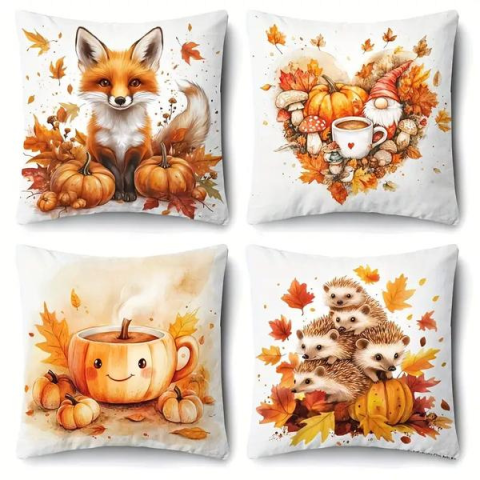 4 darabos Őszi Stílusú Dekoratív Párnahuzat Szett QF362667Hozz őszi hangulatot otthonodba ezzel a bájos, 4 darabos párnahuzat szettel, amely tökéletes választás nappaliba, hálószobába vagy akár teraszra is. A rusztikus farmház stílusú huzatok különleges grafikákkal díszítettek: vidám rókával, süncsaláddal, tökkel és szezonális mintákkal.Jellemzők:Kiszerelés: 4 db dekoratív párnahuzatMéret: kb. 45,7 × 45,7 cm (18 × 18 inch)Anyag: prémium minőségű polié