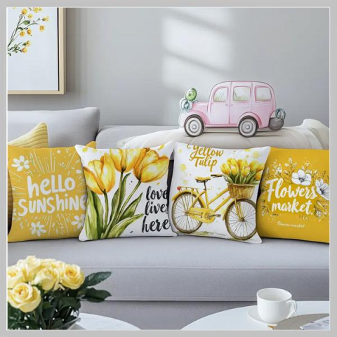 4 darabos sárga tulipános díszpárnahuzat szett cipzáras RX1138557Frissítsd fel otthonod hangulatát ezzel az élénk és vidám, sárga árnyalatokban pompázó párnahuzat szettel! A 4 darabos kollekció modern, kortárs dizájnnal és tavaszias hangulatot árasztó motívumokkal – sárga tulipánokkal, biciklivel, feliratokkal – díszített, így kiválóan illik nappaliba, hálószobába vagy akár a teraszra is.A huzatok kiváló minőségű poliészter anyagból készültek, amely